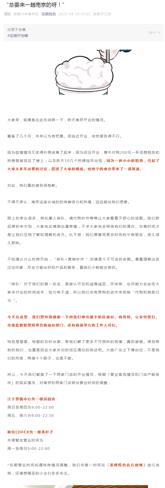 同時(shí),茶顏悅色將根據(jù)營(yíng)業(yè)客流情況和門店產(chǎn)能條件的現(xiàn)實(shí)情況,對(duì)南京的兩家門店做出營(yíng)業(yè)時(shí)間的調(diào)整。